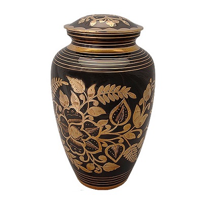 The Large Black Rose Urn is a beautifully finished urn with detailed body of rose, fern and leaves in polished brass set on a polished black body. The Urn measures 10½ inches tall. It has a screw top lid to secure the contents. A matching keepsake is available for this urn, which is linked below.