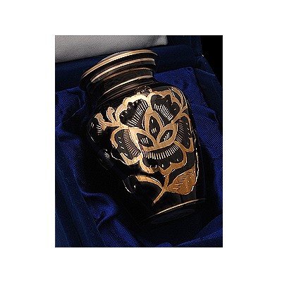 The Black Rose Keepsake Urn is a beautifully finished urn with detailed body of rose, fern and leaves in polished brass set on a polished black body. This measures 3" high approx. It has a screw top lid to secure the contents, and comes in a blue velvet display case.
