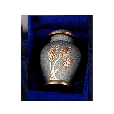 The Ash Grey Corn Keepsake Urn is a stunning urn with a mottled grey body and brass bands around the base and collar with a detailed brass corn motif engraved on the front. A stunning solid brass keepsake. This measures 3" high approx. It has a screw top lid to secure the contents, and comes in a blue velvet display case