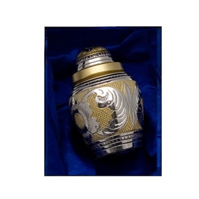 The Egyptian Gold Keepsake Urn is a striking cremation urn of superb quality, with polished silver detail on a yellow gold background. This measures 3" high approx. It has a screw top lid to secure the contents, and comes in a blue velvet display case