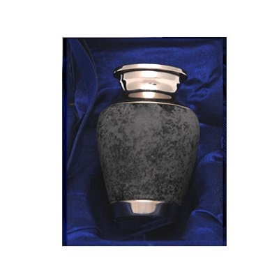 The Pastel Charcoal Keepsake Urn is an attractive urn with a pastel charcoal background and polished silver bands, to the top, neck and bottom of the urn. This measures 3" high approx. It has a screw top lid to secure the contents, and comes in a blue velvet display case