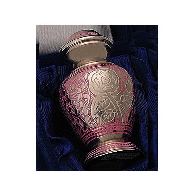 The Large Pink Rose Urn is a magnificent urn with a fine pink detailed body and a polished silver rose motif to the front and back. Beautifully finished. This measures 3" high approx. It has a screw top lid to secure the contents, and comes in a blue velvet display case