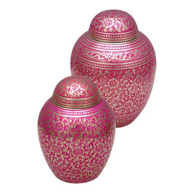 The Pink Embossed Urn is a lovely urn with an embossed pink and silver pattern to the body. This urn is available in 4½" & 5½" tall. It has a screw top lid to secure the contents.